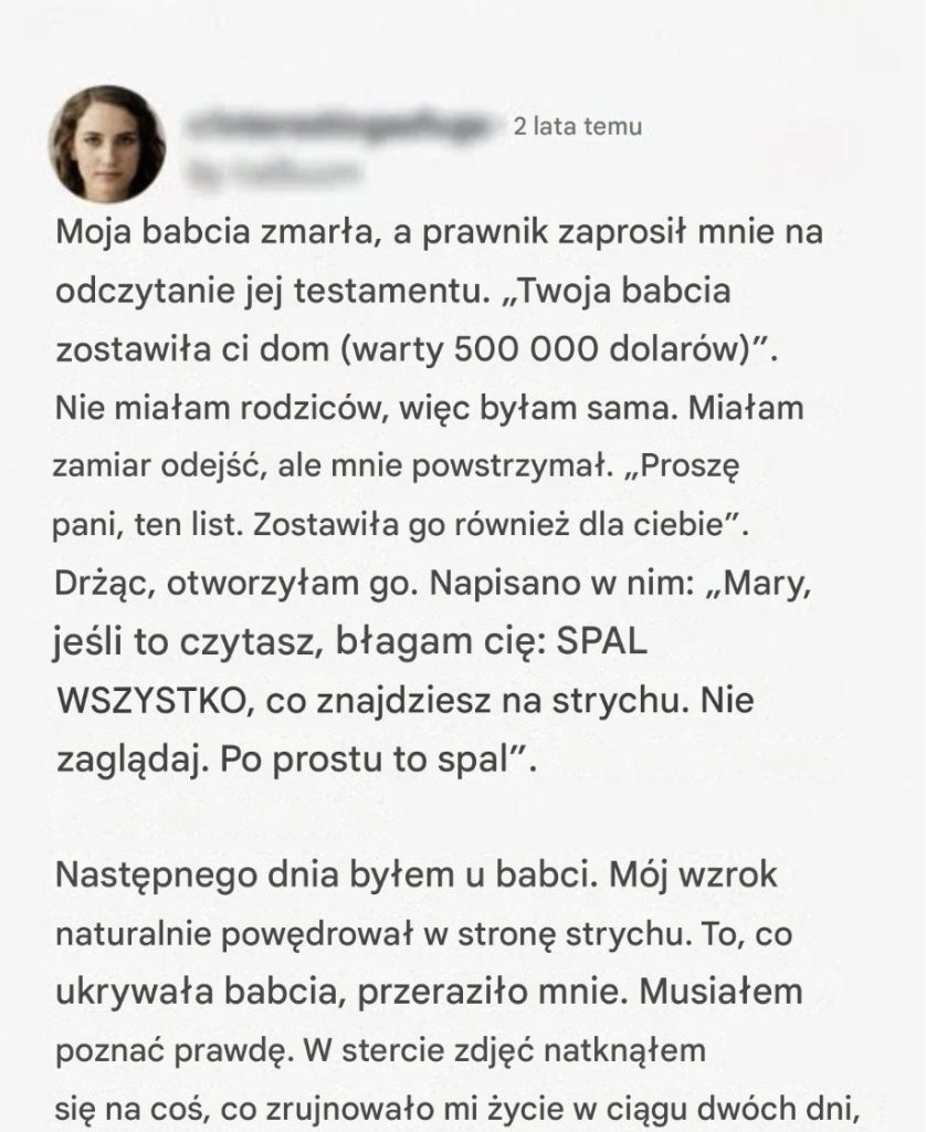 Kiedy moja babcia zmarła, zostawiła mi swój dom i notatkę, która przeraziła mnie do szpiku kości: „Spal wszystko, co jest na strychu.” Z początku to zignorowałam. Może to był po