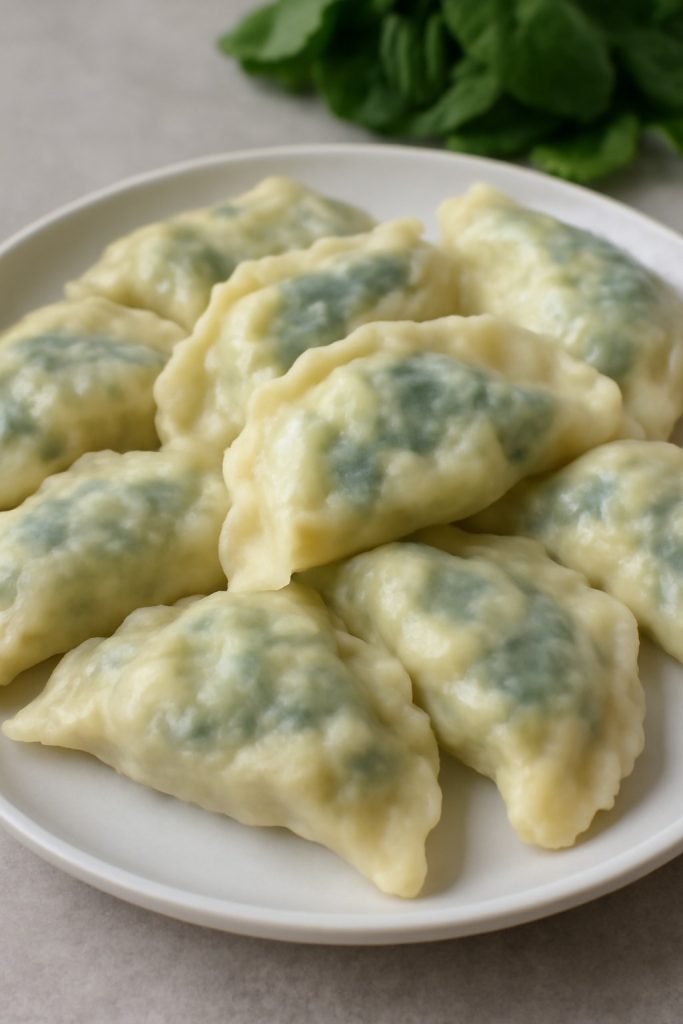 Składniki: 500 g mąki pszennej 1 szklanka gorącej wody (nie wrzątku, ale bardzo gorącej) 1/2 łyżeczki soli Składniki na farsz: 300 g świeżego lub mrożonego szpinaku 200 g sera feta