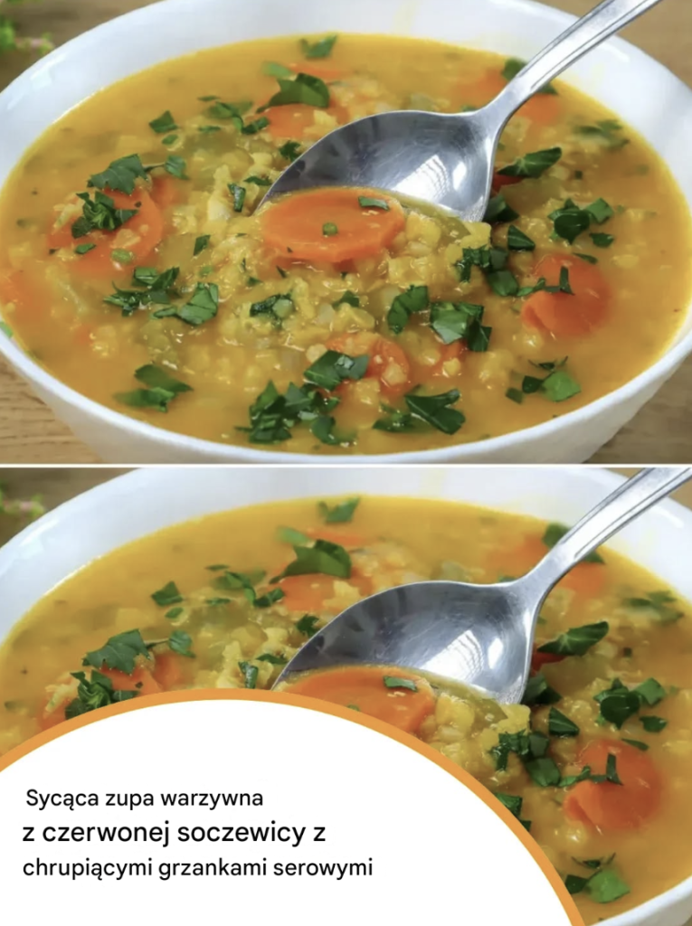 Sycąca zupa warzywna z czerwonej soczewicy z chrupiącymi grzankami serowymi Poczuj prawdziwą wygodę dzięki tej niezwykle sycącej zupie warzywnej z czerwonej soczewicy, która sprawi, że za każdym razem będziesz chciał