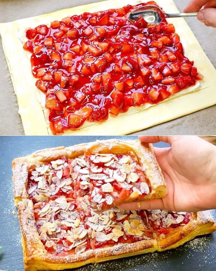 Składniki: 1 rolka ciasta francuskiego 100 g sera do smarowania 1 łyżeczka ekstraktu waniliowego 75 g dżemu truskawkowego 125 g truskawek 1 jajko Płatki migdałowe Cukier
