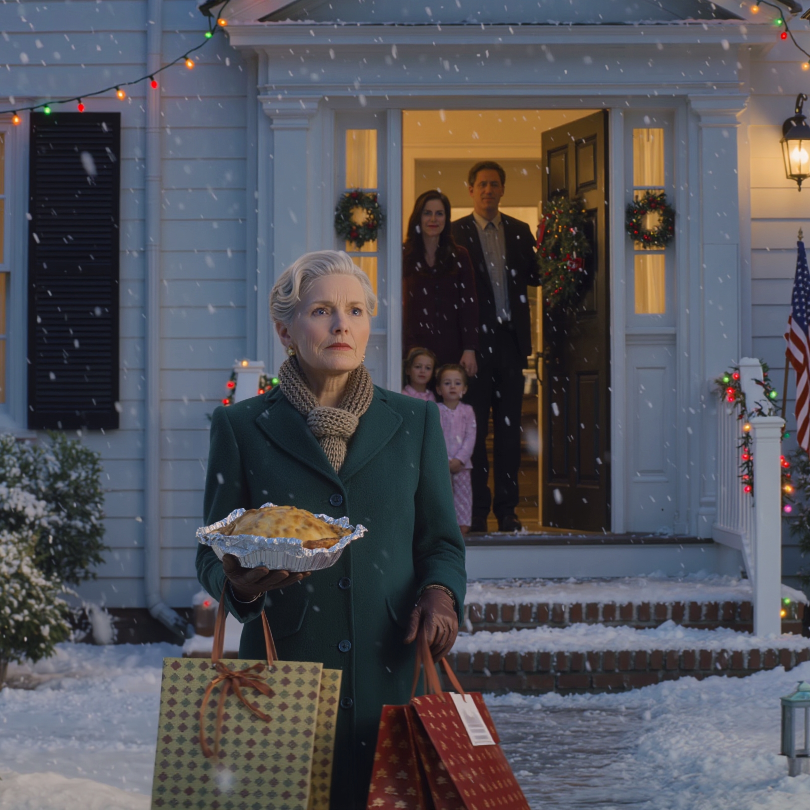 Stałem tam na śniegu, trzymając szarlotkę, wpatrując się w wieniec na ich drzwiach. W środku słyszałem świąteczną muzykę. Śmiech. Moje wnuki pytały: