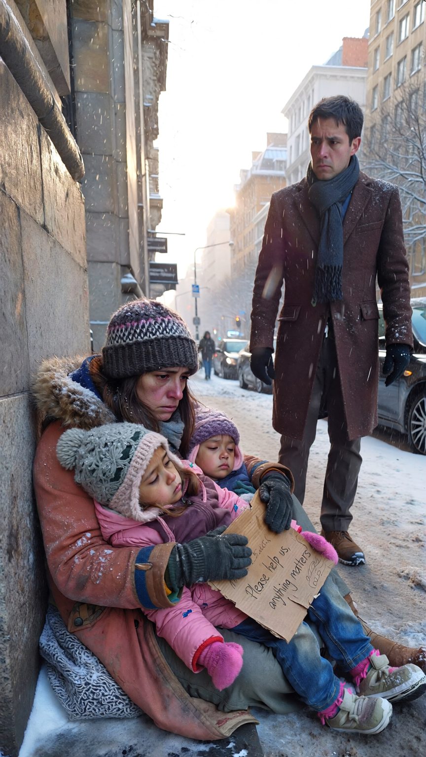 Niewielki zawiniątko z kocami leżało przyciśnięte do ceglanej ściany, nieruchome, z wyjątkiem lekkiego drżenia najmłodszego dziecka w środku. Troje dzieci tuliło się do siebie, z policzkami czerwonymi od zimna. Obok nich siedziała kobieta, z płaszczem postrzępionym na rękawach i włosami spiętymi w zmęczony kok. Trzymała tabliczkę napisaną drżącym pismem: „Proszę, pomóżcie nam”.