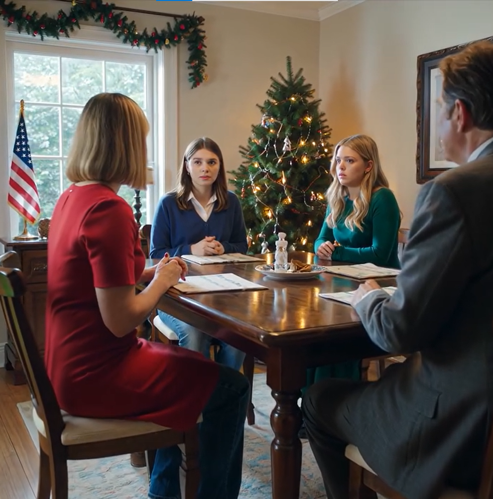 Mama siedziała wyprostowana na końcu stołu, z dłońmi złączonymi w nieruchomej, przemyślanej pozie. Tata stał obok niej ze spuszczonym wzrokiem i mocno zaciśniętymi ramionami, jakby ćwiczył milczenie zamiast mówienia.