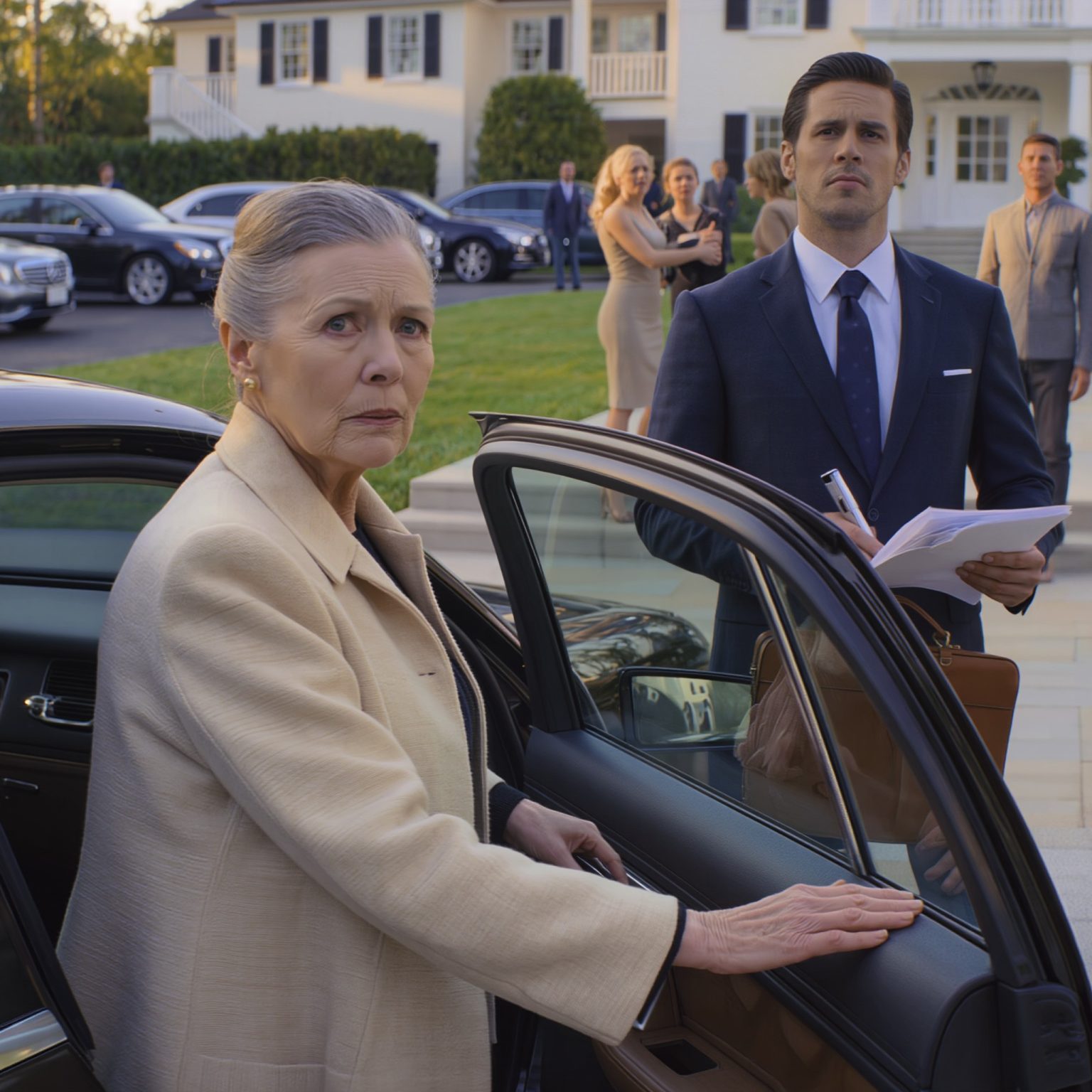 Dokładnie o 15:00 pierwszy czarny samochód wjechał na okrągły podjazd Marshalla. Potem kolejny. I kolejny. Jeden po drugim, aż ulica wyglądała jak należąca do kolumny samochodów. Sąsiedzi wchodzili na werandy. Zasłony się poruszały. A kiedy drzwi wejściowe Marshalla się otworzyły, Damian poprawił mankiet, jakby miał wejść do sądu, spojrzał na mnie raz i skinął głową.