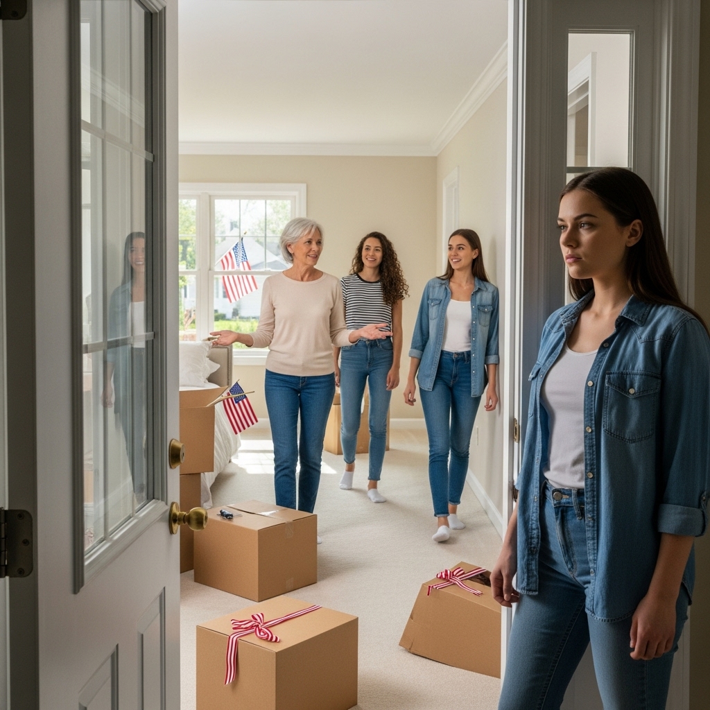 Moje trzy starsze siostry – Briana, Laya i Tessa – stoją po jej bokach, wskazując na nią i rozmawiając z podekscytowaniem. Duża ciężarówka z napędem na cztery koła stoi na krawężniku, a jej ciężka metalowa rampa jest rozłożona na cichej ślepej uliczce. Przy rampie stoją dwaj mężczyźni w niebieskich kombinezonach, trzymając wózek, z wyrazem dezorientacji, ale i rezygnacji.