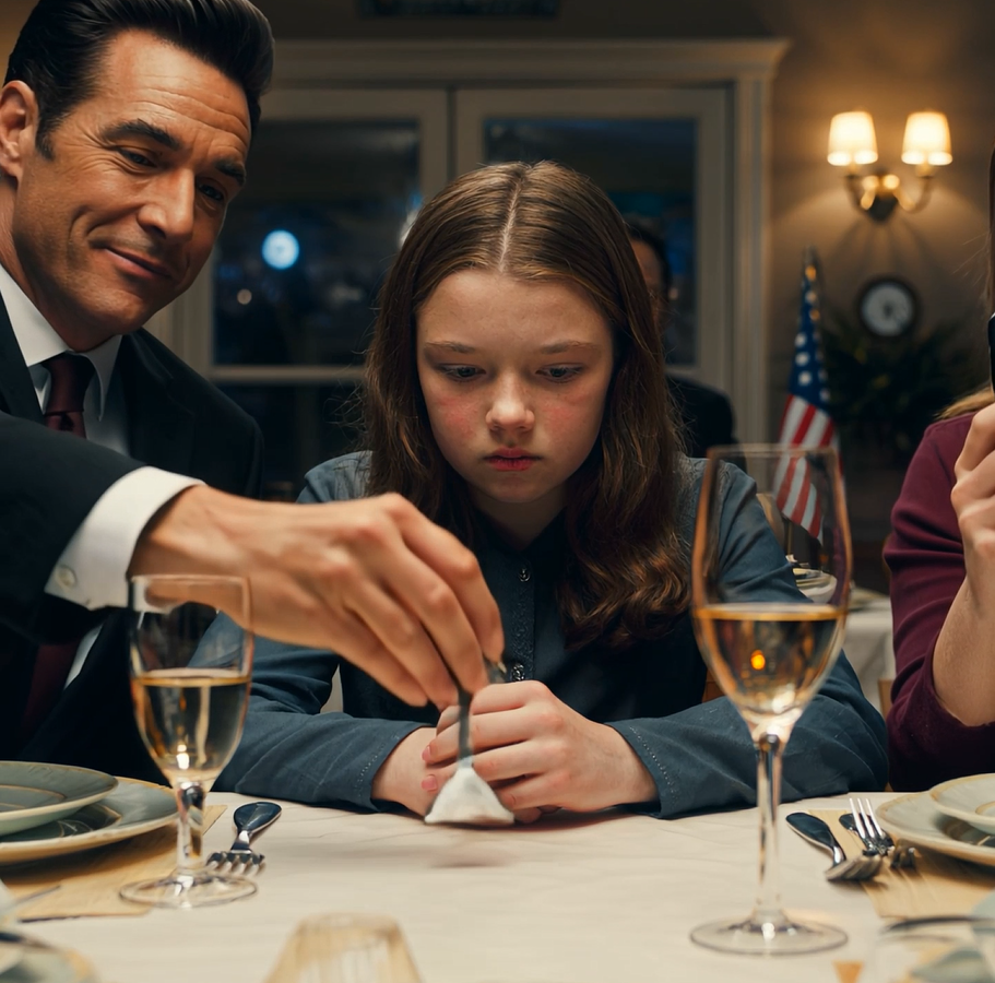 Tata uśmiechnął się znad krawędzi szklanki. „Wiesz, że cię kochamy” – dodał, jakby miłość i publiczne upokorzenie mogły być jednym słowem.