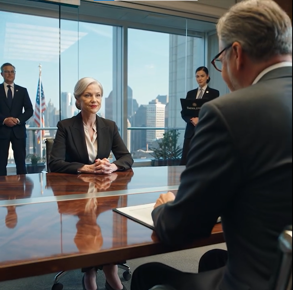 Przy długim stole siedziało siedem osób, wszyscy ubrani w ciemne garnitury.