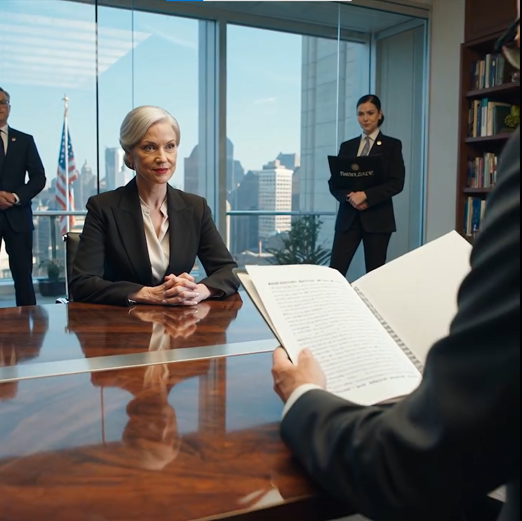 Przy długim stole siedziało siedem osób, wszyscy ubrani w ciemne garnitury.