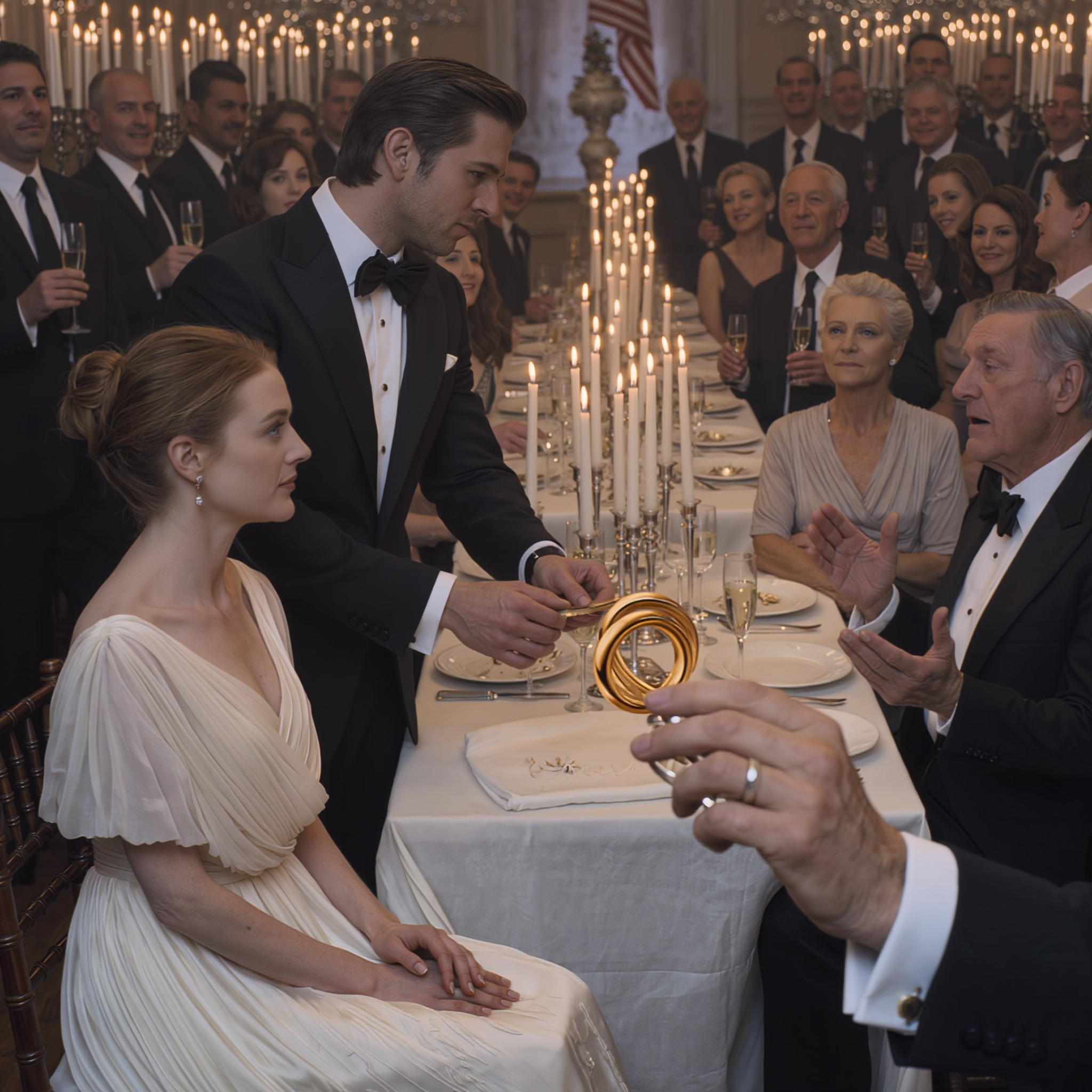 Wstał powoli, górując nad sceną swoim wzrostem 190 cm. Potem, z rozmysłem, sięgnął w dół i zdjął obrączkę. Platynowa obrączka odbiła światło, gdy ją uniósł. W pomieszczeniu zapadła całkowita cisza.