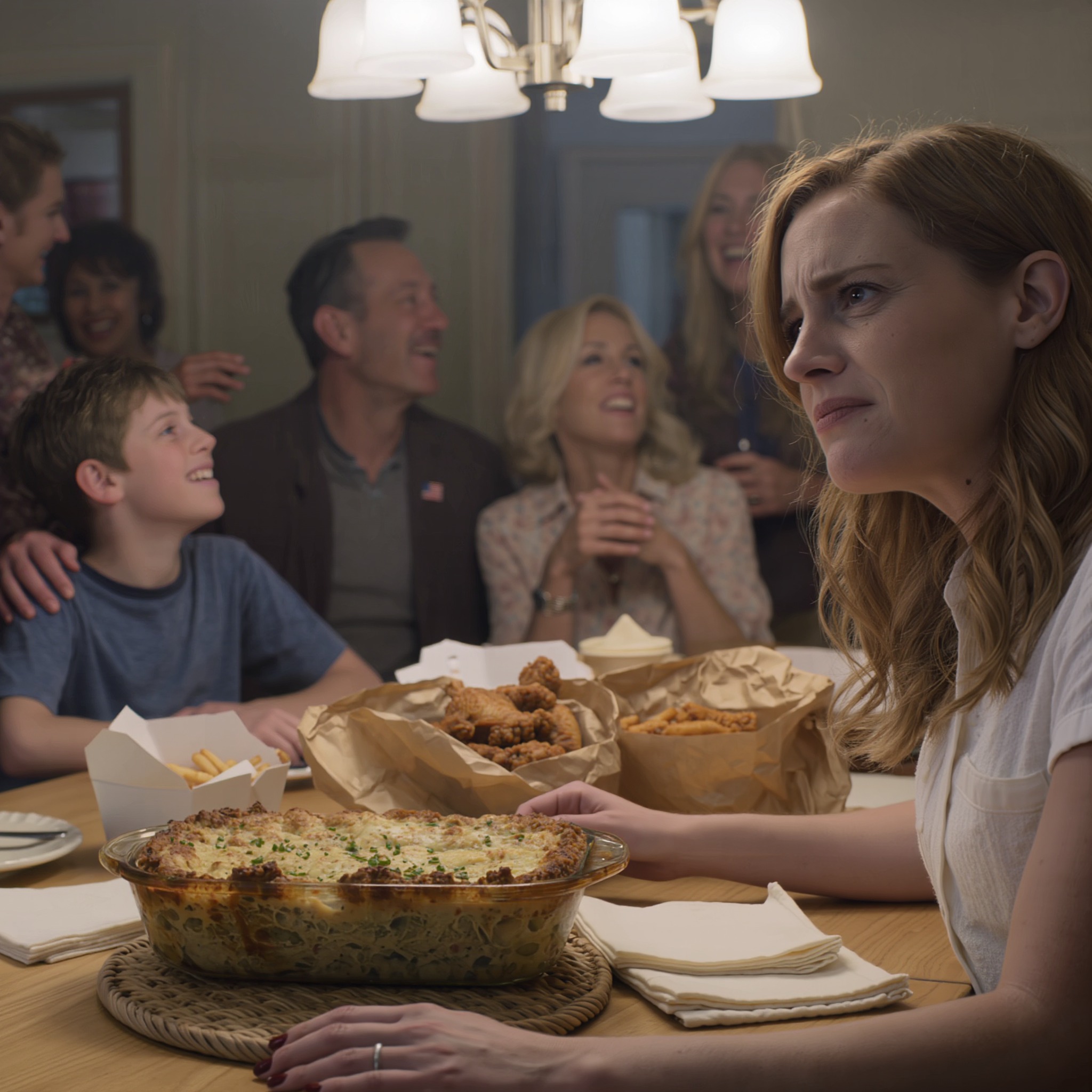 Potem wskazała na plastikowe torby z jedzeniem na wynos, które mój brat Derek położył na środku stołu jak flagę. Skrzydełka i miękkie frytki, tłuszcz przesiąkający przez papier.