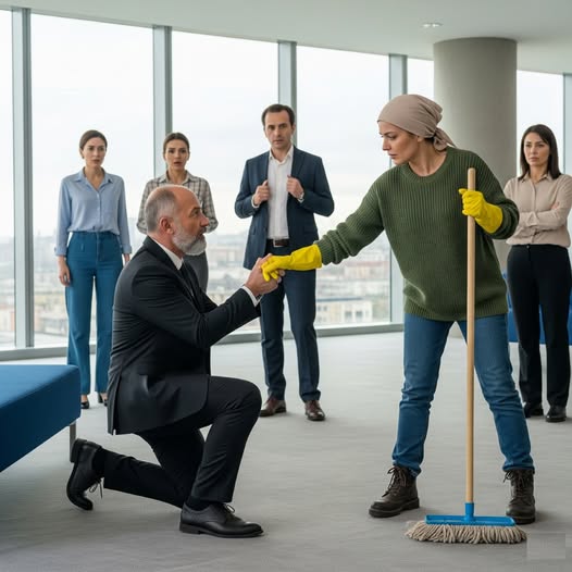 Stała jak sparaliżowana, z mopem w ręku, wpatrując się w najpotężniejszego mężczyznę w firmie, który teraz drżał, a jego dłonie obejmowały jej dłonie niczym człowieka na rozprawie błagającego o cud.