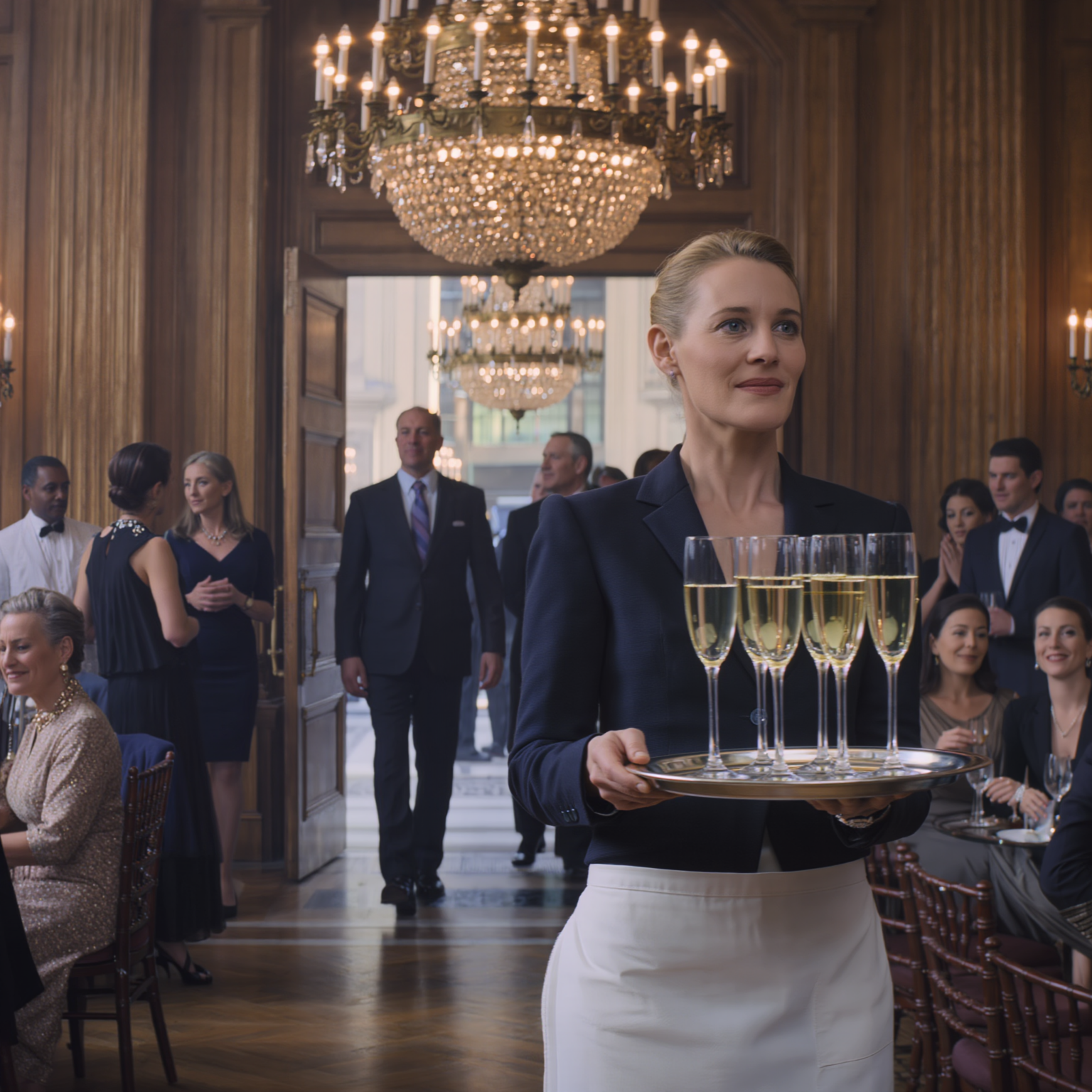Obserwowałem Sophię, młodą kelnerkę, którą wcześniej zauważyłem, podchodzącą do kręgu. Trzymała srebrną tacę z krabowymi plackami, a jej ręce lekko drżały. Czekała na przerwę w rozmowie – uprzejma, pełna szacunku.