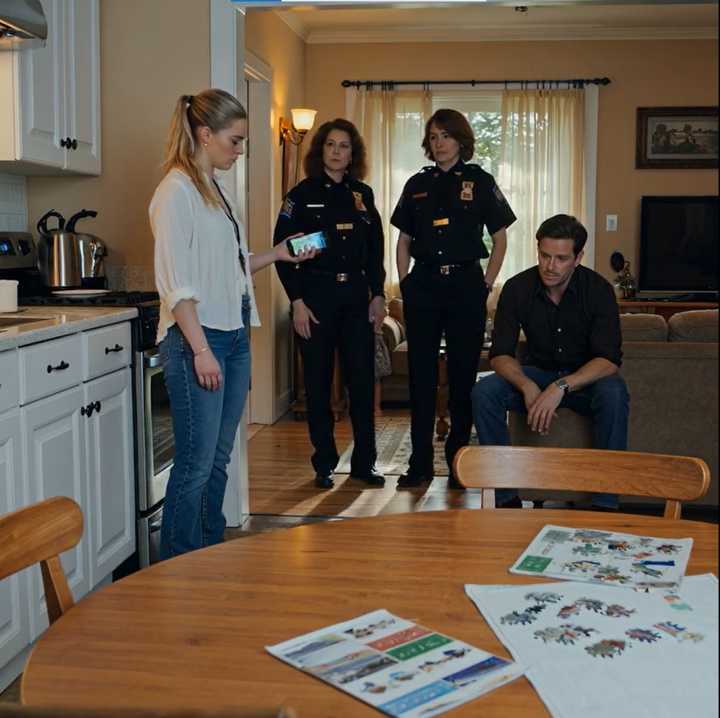 Przeglądając dokumenty na tablecie, jego wyraz twarzy zmienił się z neutralnego na bardziej skupiony. Oficer Bennett pochylił się, żeby spojrzeć, i wymienili spojrzenia, które mówiły więcej niż słowa.