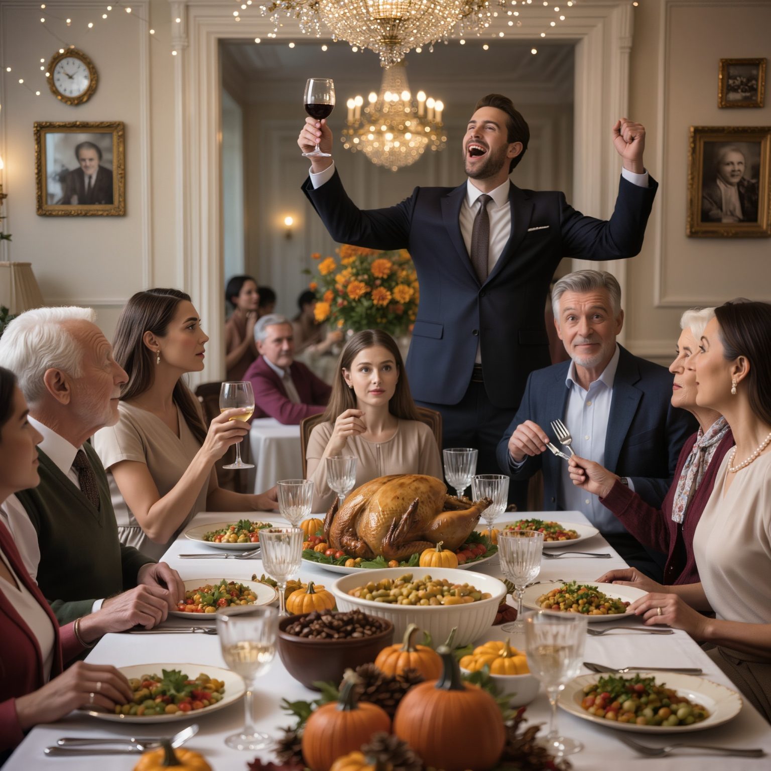 Stół wybuchnął wiwatami, brawami, a nawet gwizdami. Atmosfera przypominała raczej koronację niż Święto Dziękczynienia.