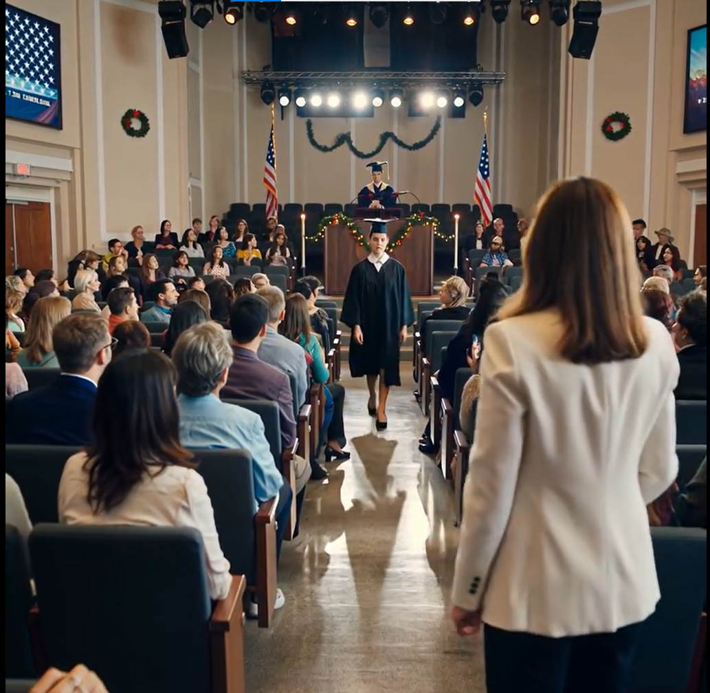 Byłem w połowie drogi do podium, gdy krzesło zaskrzypiało za mną, na tyle ostro, że rozdarło moment. Podczas mojej własnej ceremonii ukończenia szkoły, moja siostra wstała i wskazała na mnie palcem, jakby ogłaszała werdykt.