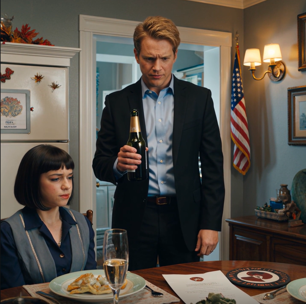 „Jake, wyglądasz ładnie” – zachwycała się mama, przyjmując jego podarunek. „I przyniosłeś wino. Jak miło”.