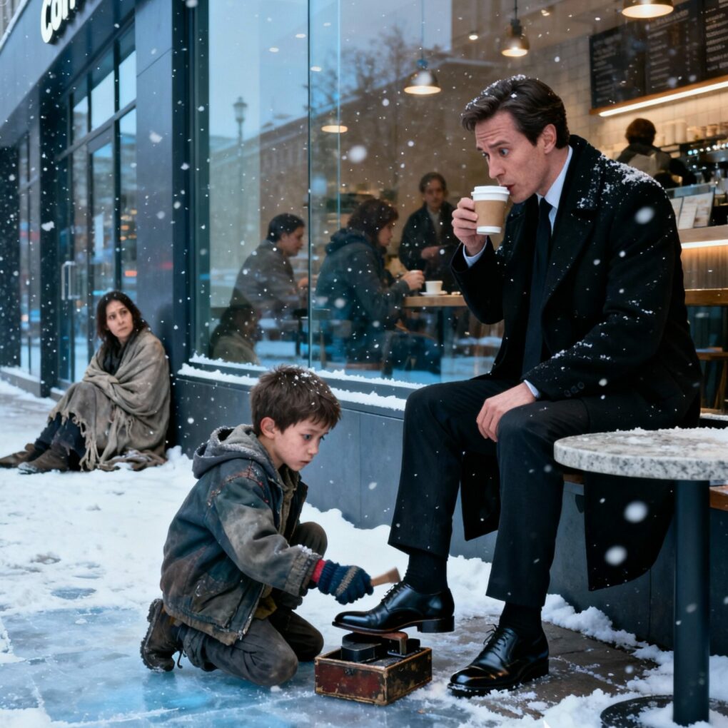 Ale chłopak nie odszedł. Zamiast tego uklęknął na zaśnieżonym chodniku, wyciągnął zestaw do czyszczenia butów i powiedział cicho: „Proszę pana. Tylko dziesięć dolarów. Mogę na to zapracować. Nie chcę jałmużny”.