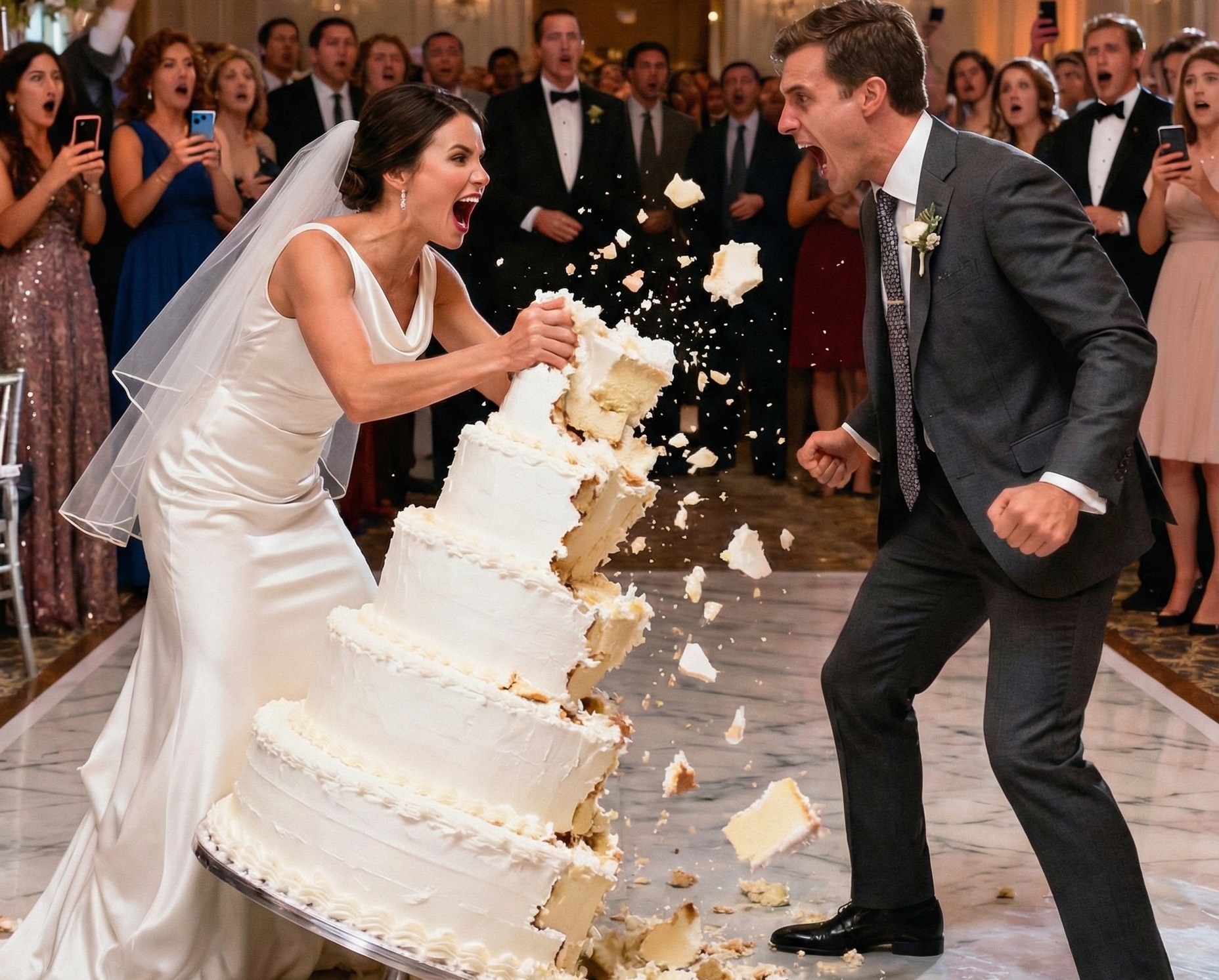 Wszyscy tłoczyli się wokół nas, gdy strzelisty, siedmiopiętrowy tort weselny wtoczył się na środek marmurowej posadzki. Jego budowa zajęła trzy dni – biały lukier migdałowy, kwiaty z cukru, ręcznie zdobiona koronka. Ludzie zapierali dech w piersiach, widząc jego wysokość. Wyglądał wręcz nierealnie.