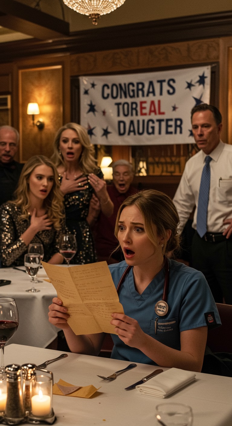 Moja rodzina zaprosiła mnie na kolację. „Mamy ważną nowinę” – powiedzieli. Kiedy przybyłem, uświadomiłem sobie, że wszyscy zebrali się, by uczcić sekret, którego nigdy nie miałem poznać. Nad stołem wisiał transparent z napisem „Gratulacje dla naszej prawdziwej córki”. Roześmiali się. „W końcu mamy powód do świętowania” – oznajmiła moja mama. Siedziałem cicho jak duch na ich uczcie, dopóki kelner nie wręczył mi małej, zapieczętowanej notatki od właściciela restauracji. To zmieniło wszystko.