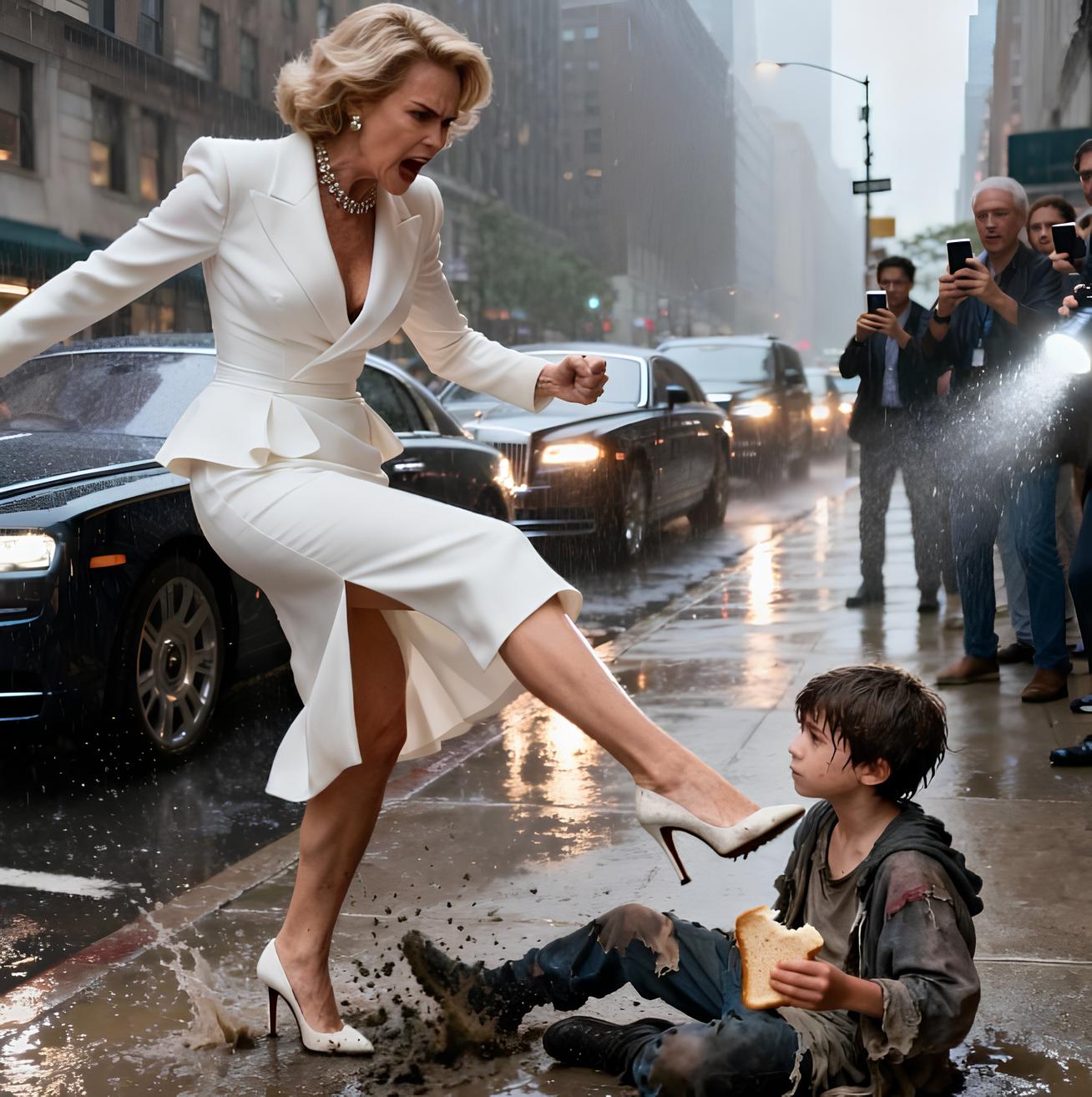 Cień przeszedł jej drogę: około dziewięcioletni uliczny chłopiec, przemoczony, ubrany w brudne i podarte ubrania. Niósł papierową torbę wypełnioną resztkami z tarasu restauracji.