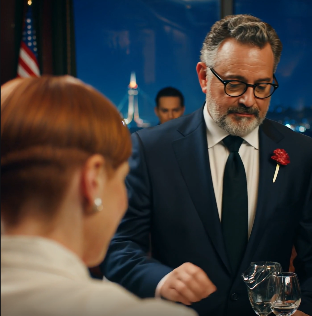 „Peter, naprawdę” – warknął Ryan, odskakując, gdy lodowata woda zalała biały obrus i skapywała na jego spodnie za tysiąc dolarów.
