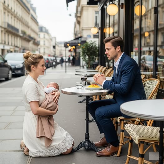 Uklękła przy jego stoliku na chodniku, tuląc dziecko. „Proszę, nie chcę twoich pieniędzy – tylko chwili twojego czasu”. Mężczyzna w garniturze podniósł wzrok znad wina, nieświadomy, że jej słowa zniszczą wszystko, co myślał, że wie.