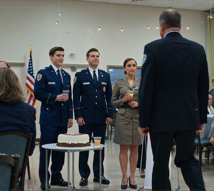 Ktoś ustawił mały stolik z tortem z napisem „Gratulacje, Kapitanie James” wylanym niebieskim lukrem. Moja mama stanęła obok, trzymając plastikowy kubek z ponczem, jakby to był szampan. Uniosła go wysoko, czekając, aż w sali zapanuje cisza.