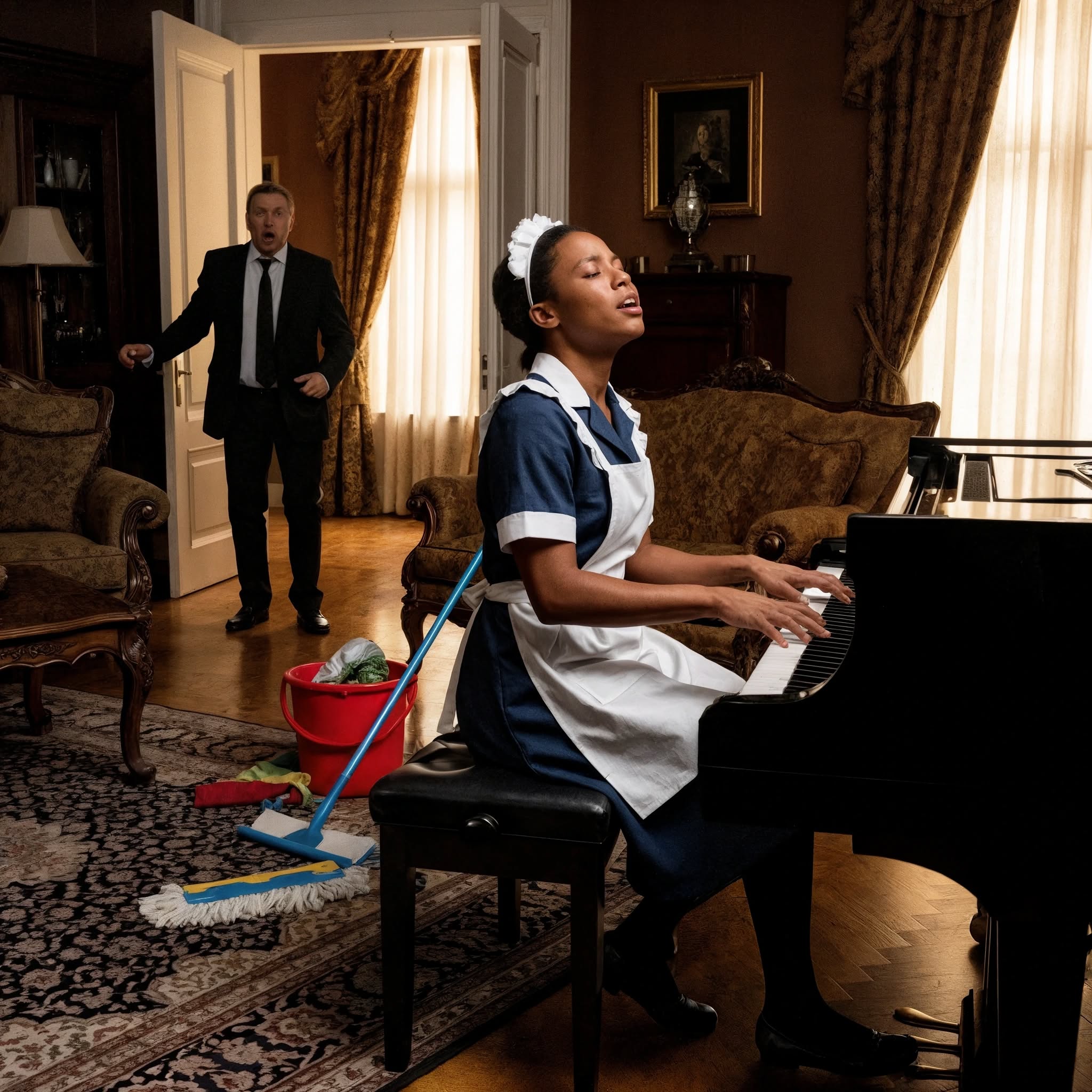 Przy pianinie, w mundurku, z fartuchem zawiązanym w pasie, obok mopa i wiadra, siedziała jej gosposia. Z zamkniętymi oczami grała z gracją, jej palce delikatnie sunęły po klawiszach. Dźwięki wypełniały pokój bolesną czułością, melodią tak bogatą, że wydawała się żywa.