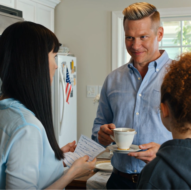 Richard wszedł właśnie do kuchni, poprawiając swój drogi krawat. Zawsze ubierał się nienagannie, nawet na nieformalne spotkania w domu, jakby wygląd mógł kontrolować rzeczywistość. Spojrzał na nas, uśmiechając się w sposób, który nie sięgał jego oczu.
